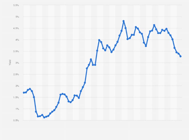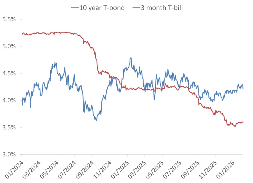 ) 10-year Treasury bond and 3-month T-bill yields from 2024 to early 2026, showing yield curve inversion.