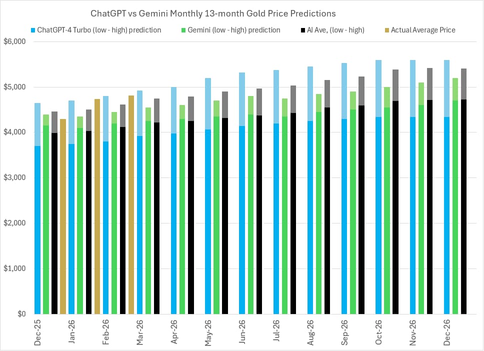 AI 기반 모델들이 2025년 12월부터 2026년 12월까지 금 가격의 점진적인 상승 흐름을 예측하는 월별 범위형 전망 차트